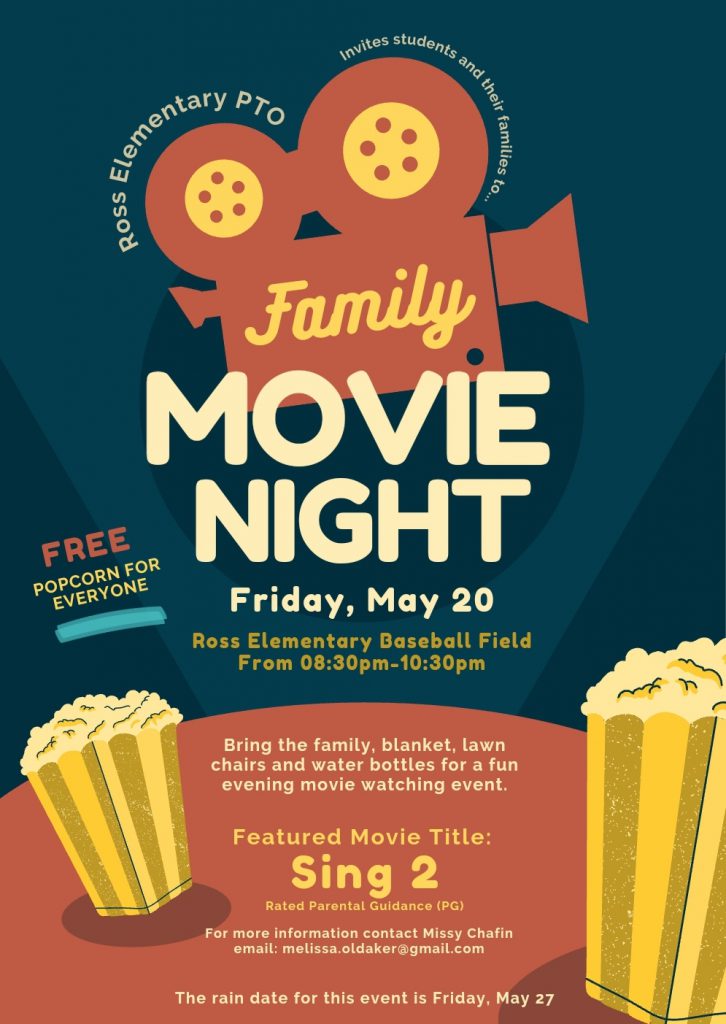 Lights, Camera, Action! Ross Elementary PTO is hosting a family movie night Friday, May 20, at 8:30 pm on the school baseball field outfield. All students, staff, and their familes are invited.